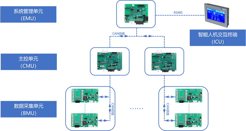 電池管理系統由數據采集單元BMU、主控單元 CMU、系統管理單元 EMU、智能人機交互終端 ICU 組成,融合高精度核心算法、主動均衡/被動均衡、主動安全策略等先進技術,實現電池單體級到系統級多層級的智能管控。